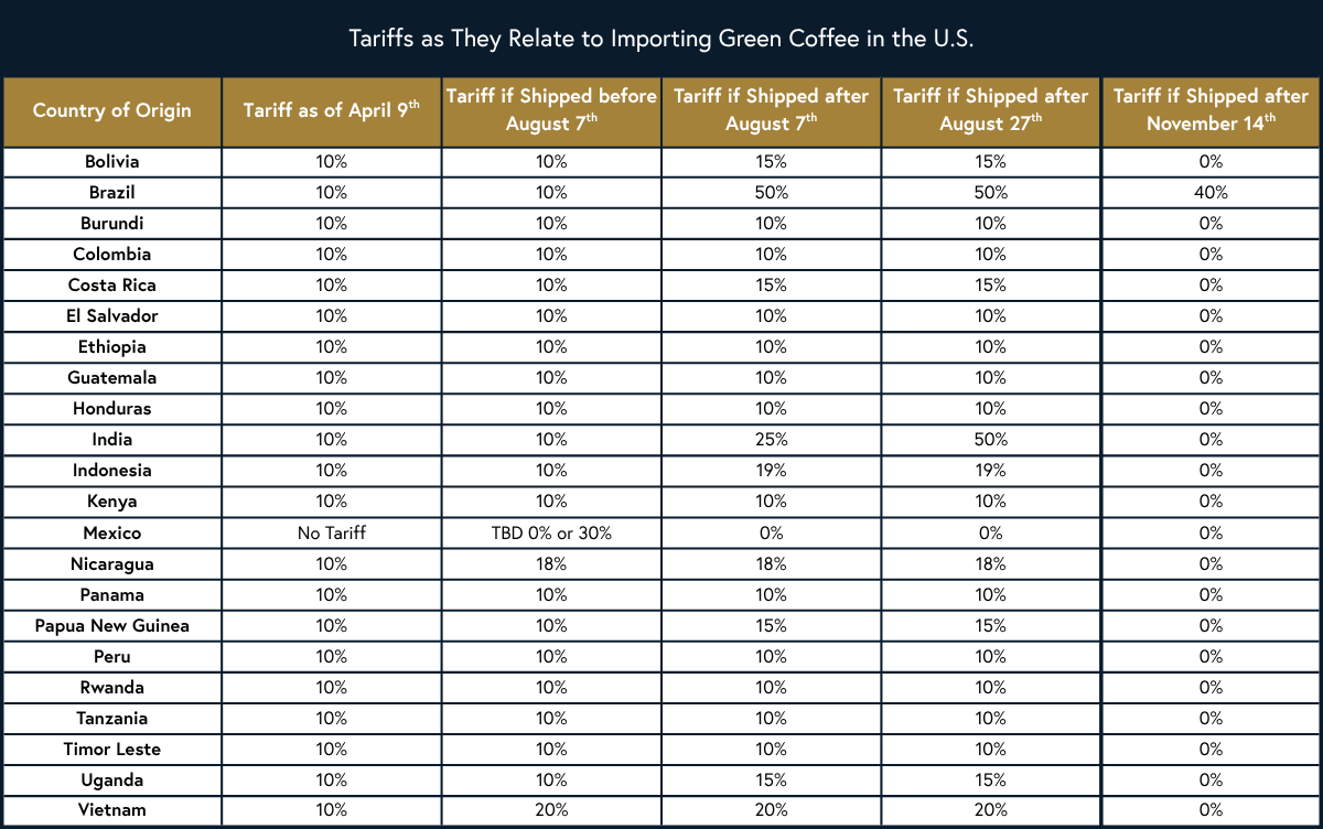 Editor’s Note 11/17/2025: The Trump Administration has rolled back reciprocal tariffs on specific agricultural goods. Tariffs in relation to green coffee imports have been updated in the chart below.
